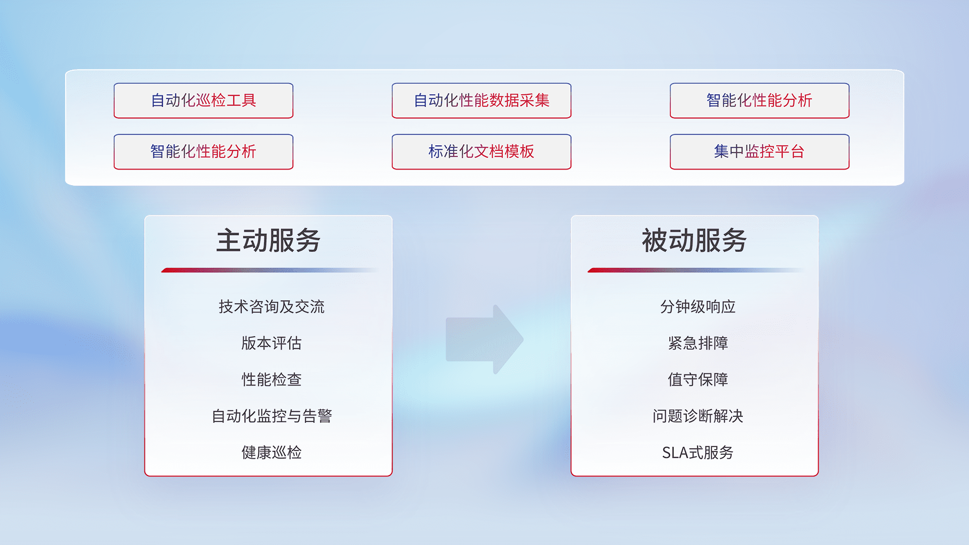 智能化工具和标准化文档,,,,保障服务质量,,提供主动服务(包含技术咨询、、、、版本评估、、、、性能检查、、、自动化监控与告警、、、、健康巡检)和被动服务包含(分钟级响应、、紧急排障、、、、值守保障、、问题诊断解决、、、、SLA服务)。。。